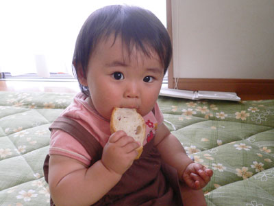 歩きまわりながら自由奔放にかじっております。普通のパンならどこかに大きいパンの欠片が落ちてたりするんだけどそれもなし!